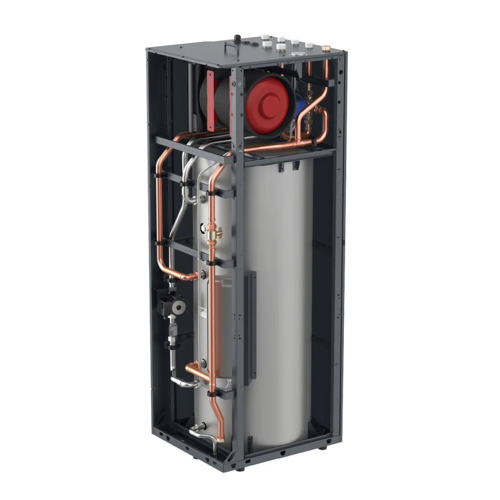 Monobloc warmtepomp met prefab geïnstalleerde Boiler & buffer, hierbij hebben we goed gekeken naar het design en installatie gemak. Door de voormontage van de boiler & buffervat hoeft er alleen nog een verbinding worden gemaakt tussen de warmtepomp en de combi. Wat veel tijd en geld kost.