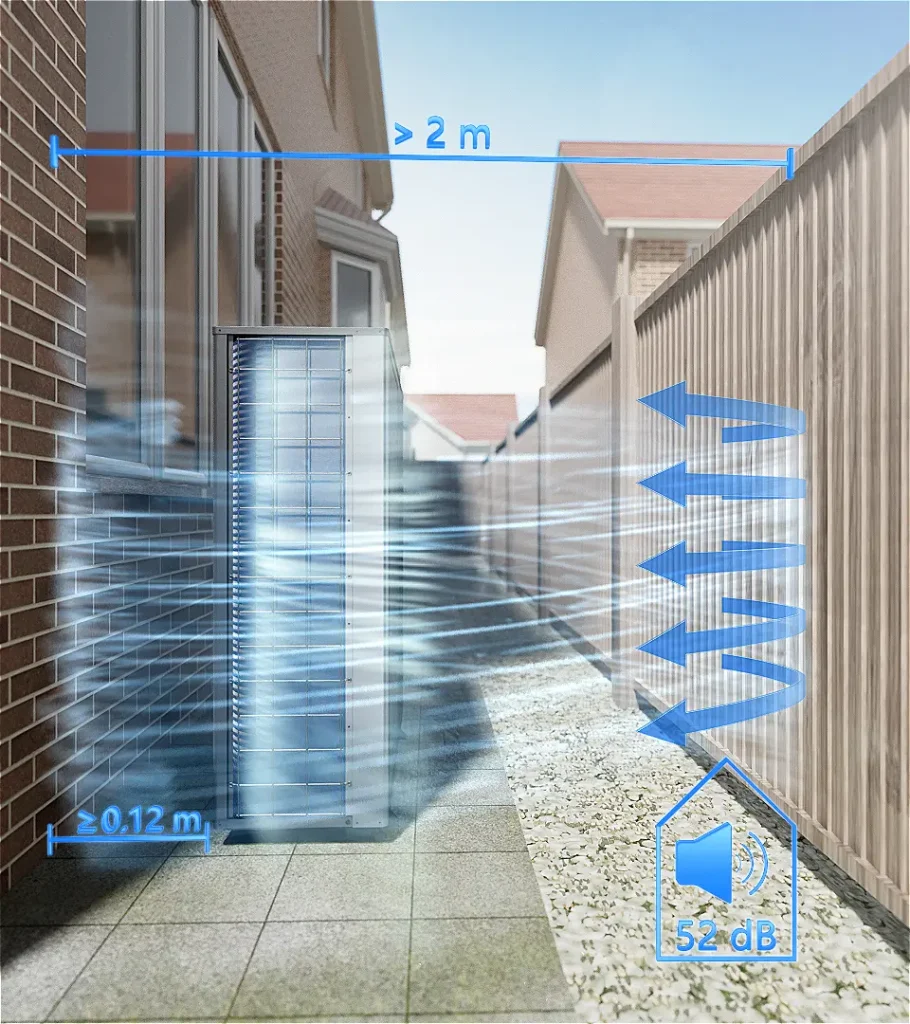 De top-blow-opstelling maakt de warmtepomp bijzonder geschikt voor compacte ruimtes zoals balkons, geschakelde woningen, smalle doorgangen of kleine tuinen, ideaal wanneer elke centimeter telt.